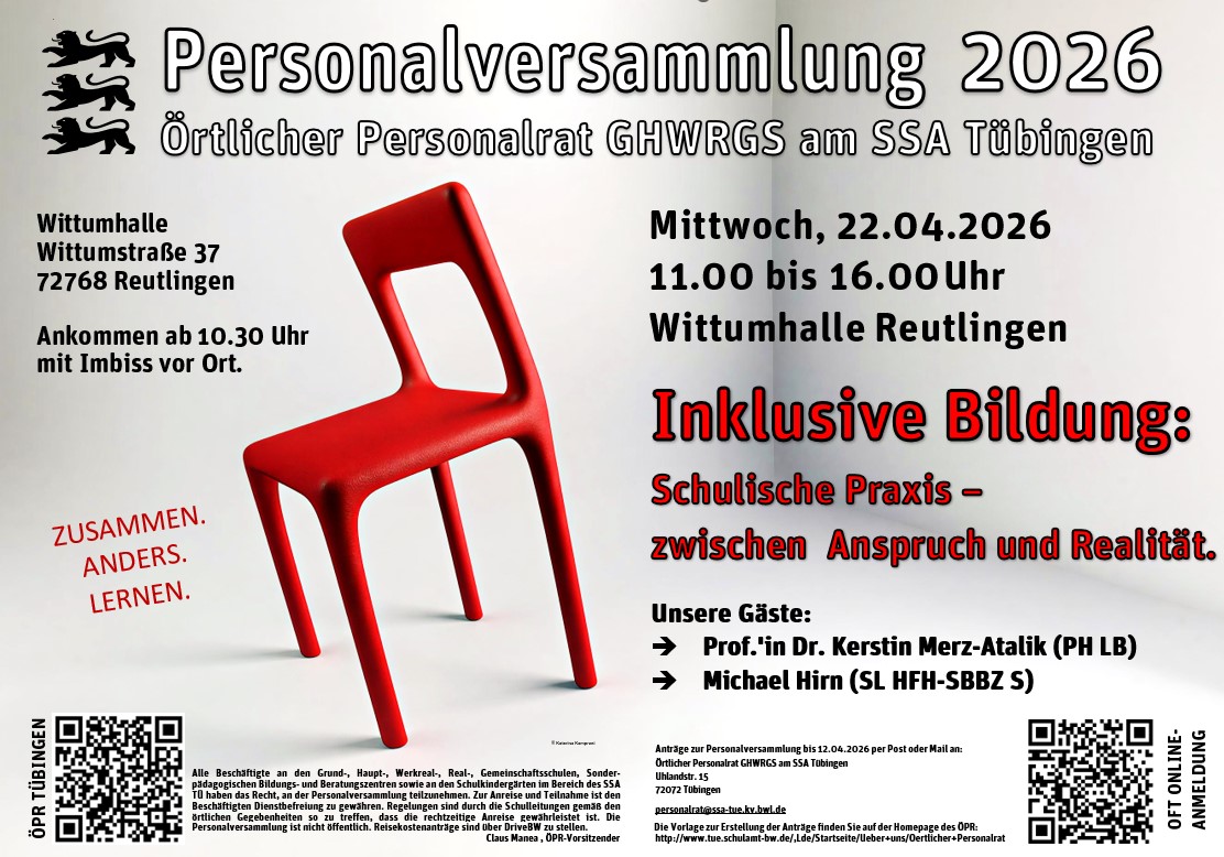 Alle Beschäftigte an den Grund-, Haupt-, Werkreal-, Real-, Gemeinschaftsschulen, Sonder- pädagogischen Bildungs- und Beratungszentren sowie an den Schulkindergärten im Bereich des SSA TÜ haben das Recht, an der Personalversammlung teilzunehmen. Zur Anreise und Teilnahme ist den Beschäftigten Dienstbefreiung zu gewähren. Regelungen sind durch die Schulleitungen gemäß den örtlichen Gegebenheiten so zu treffen, dass die rechtzeitige Anreise gewährleistet ist. Die Personalversammlung ist nicht öffentlich. Reisekostenanträge sind über DriveBW zu stellen.